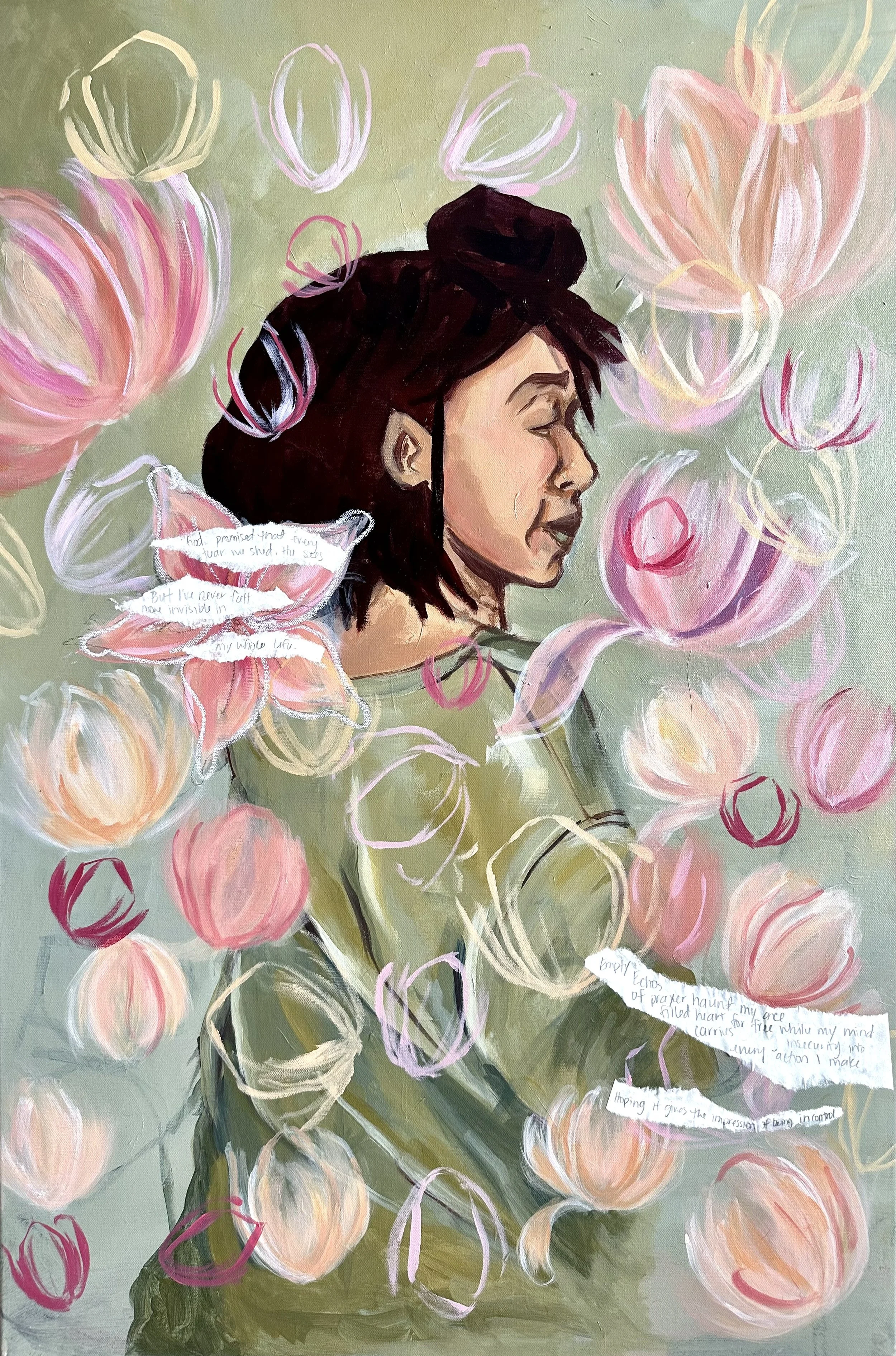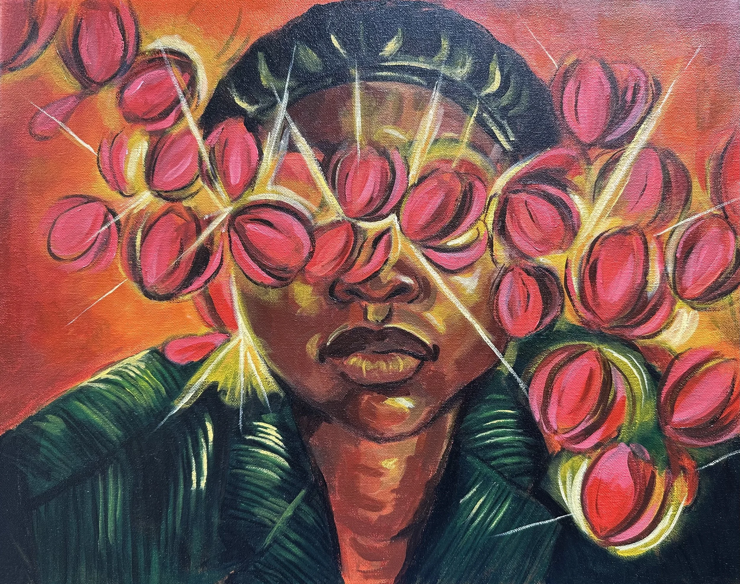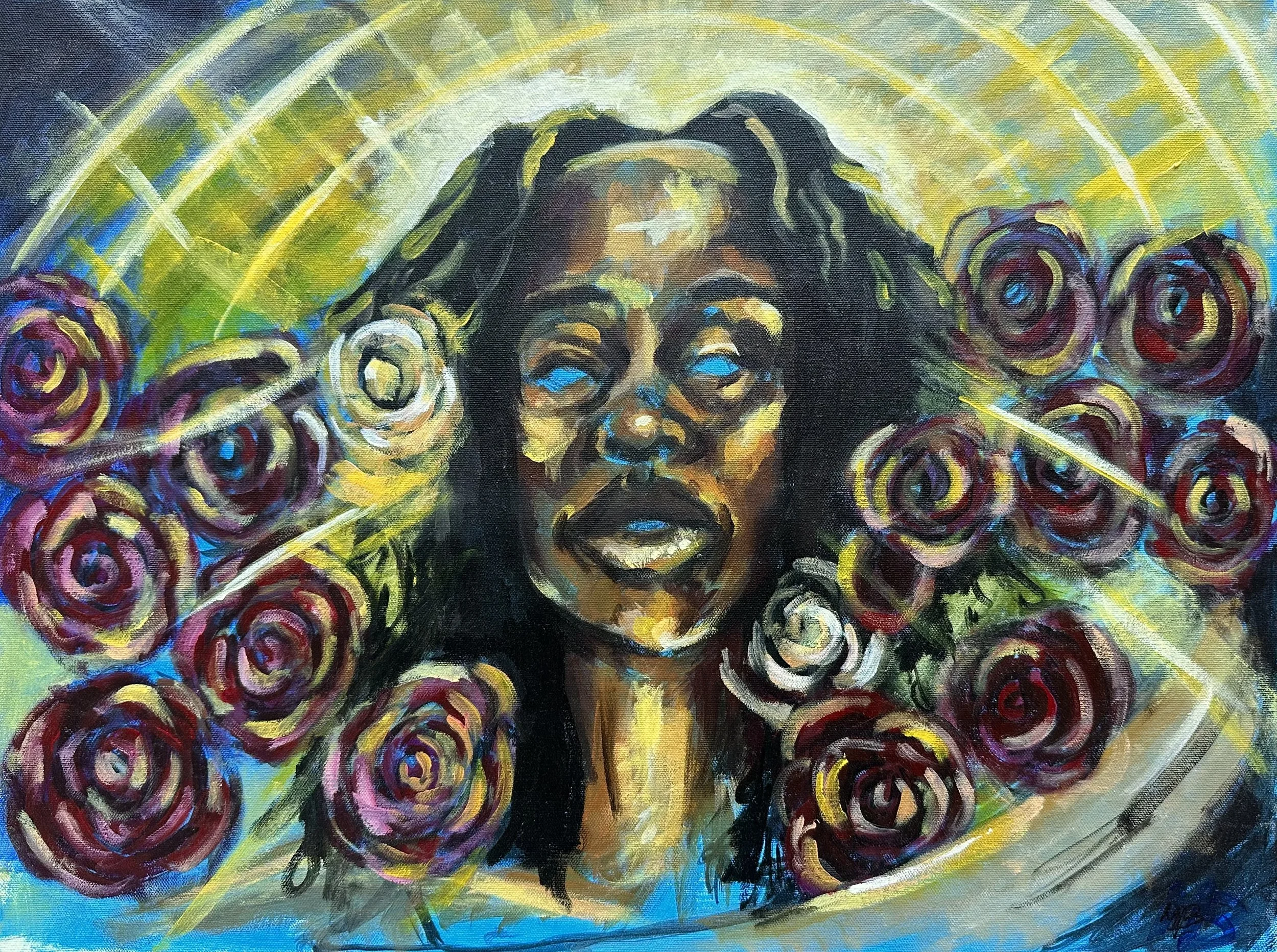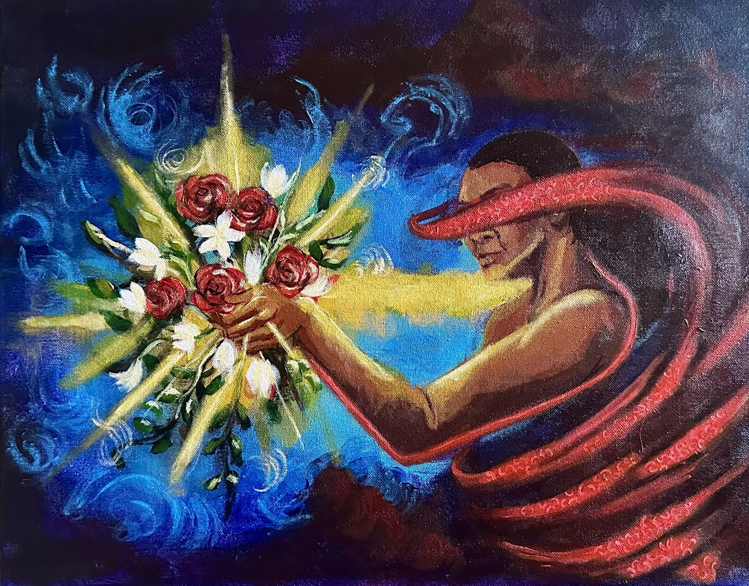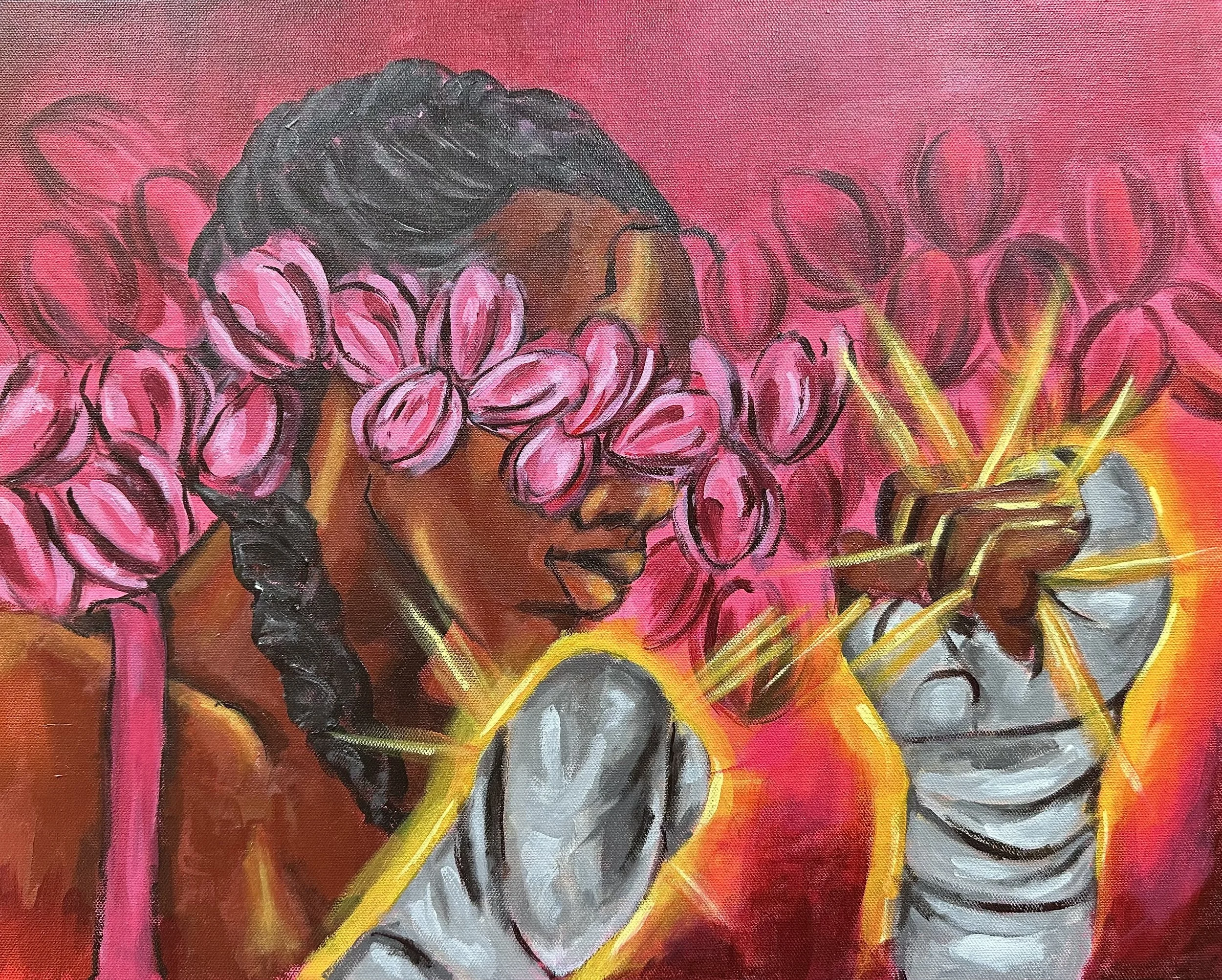 This piece was painted for a local Cycle Cell Anemia Walk held on September 13th, 2025. This piece was purchased and then donated to the event organizer. While Cycle Cell Anemia is a rare, uncommonly heard illness, it nonetheless has a tremendous impact on day to day life. This piece is to show the woman using her cycle cells to help the flowers bloom. The flowers are to symbolize hope in the midst of the suffering that is caused.