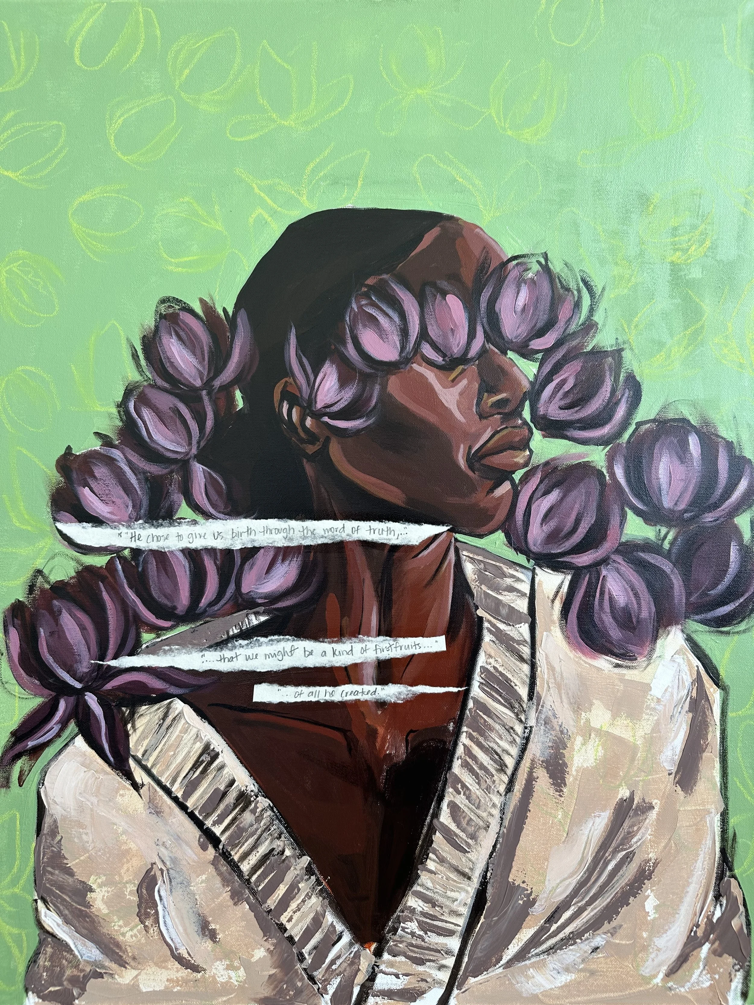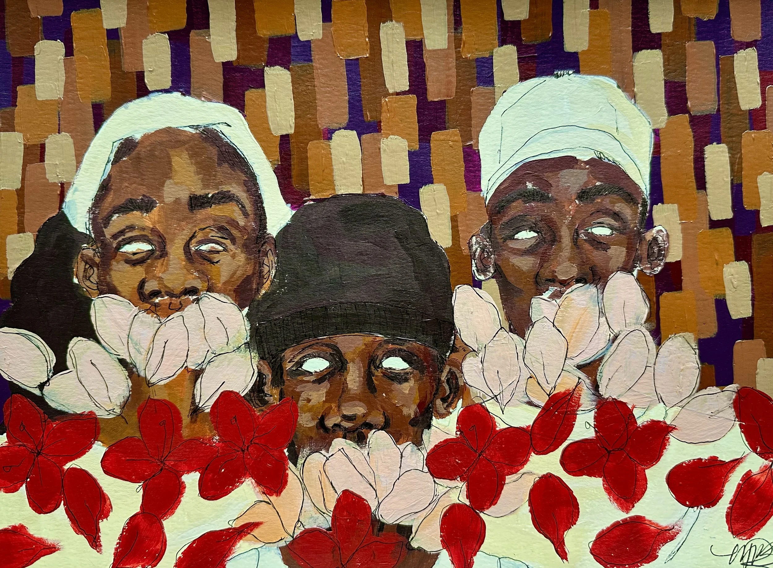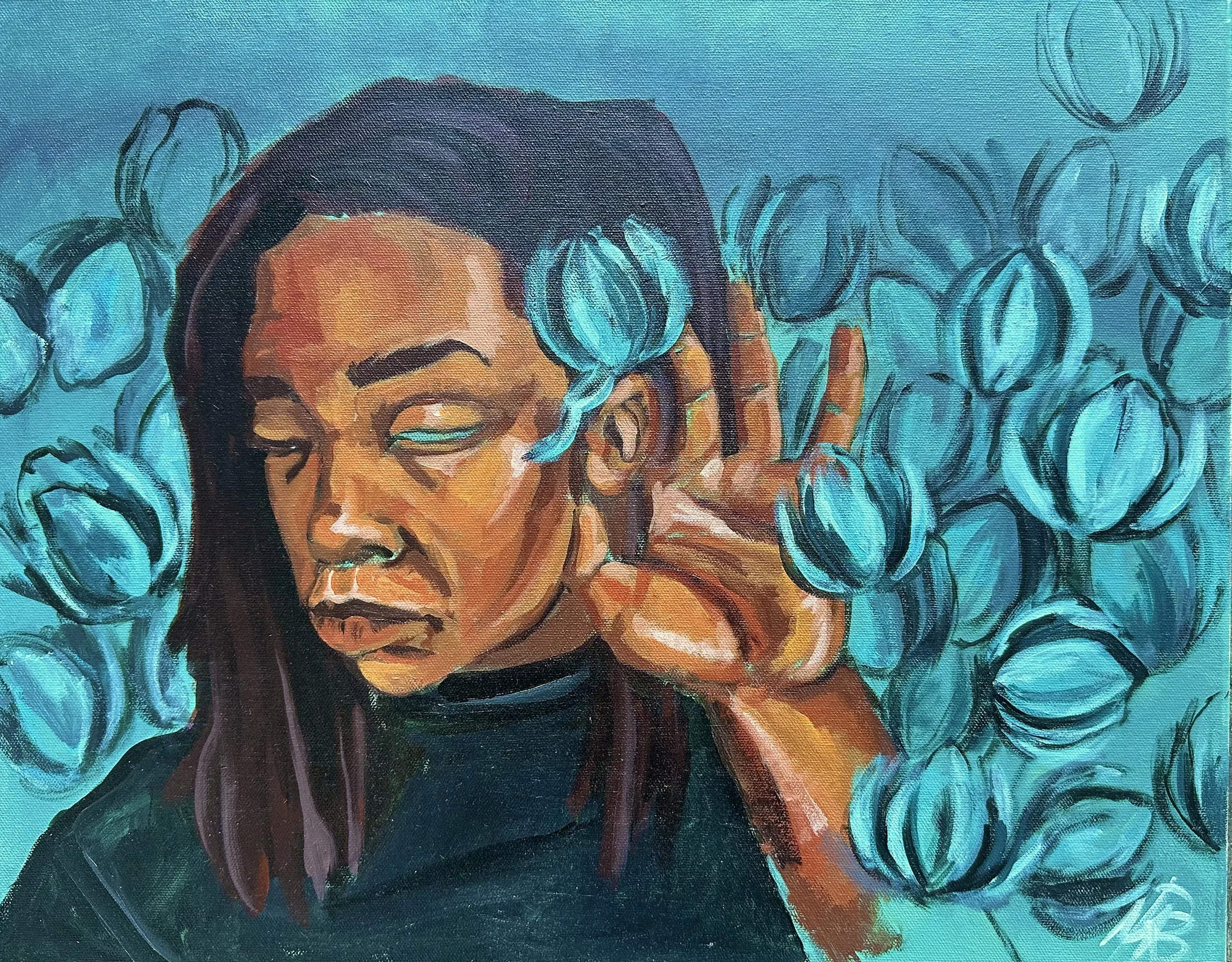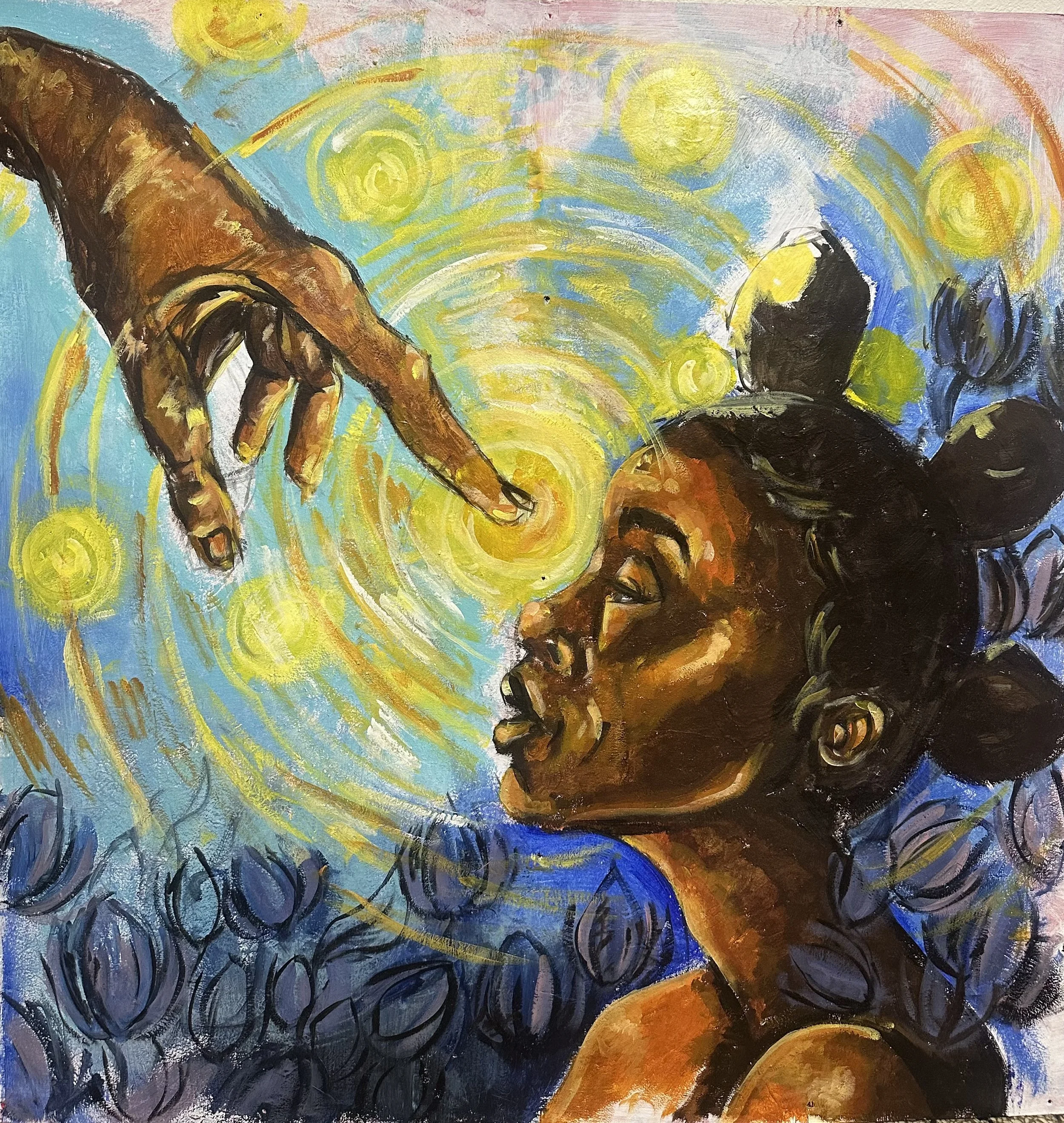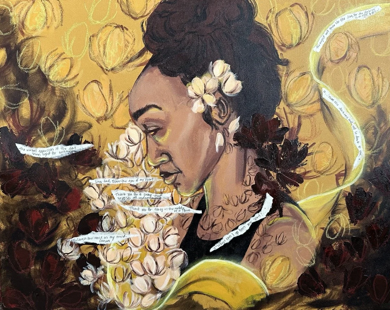 This piece was painted for a local Cycle Cell Anemia Walk held on September 13th, 2025. This piece was purchased and then donated to the event organizer. While Cycle Cell Anemia is a rare, uncommonly heard illness, it nonetheless has a tremendous impact on day to day life. This piece is to show the woman using her cycle cells to help the flowers bloom. The flowers are to symbolize hope in the midst of the suffering that is caused.