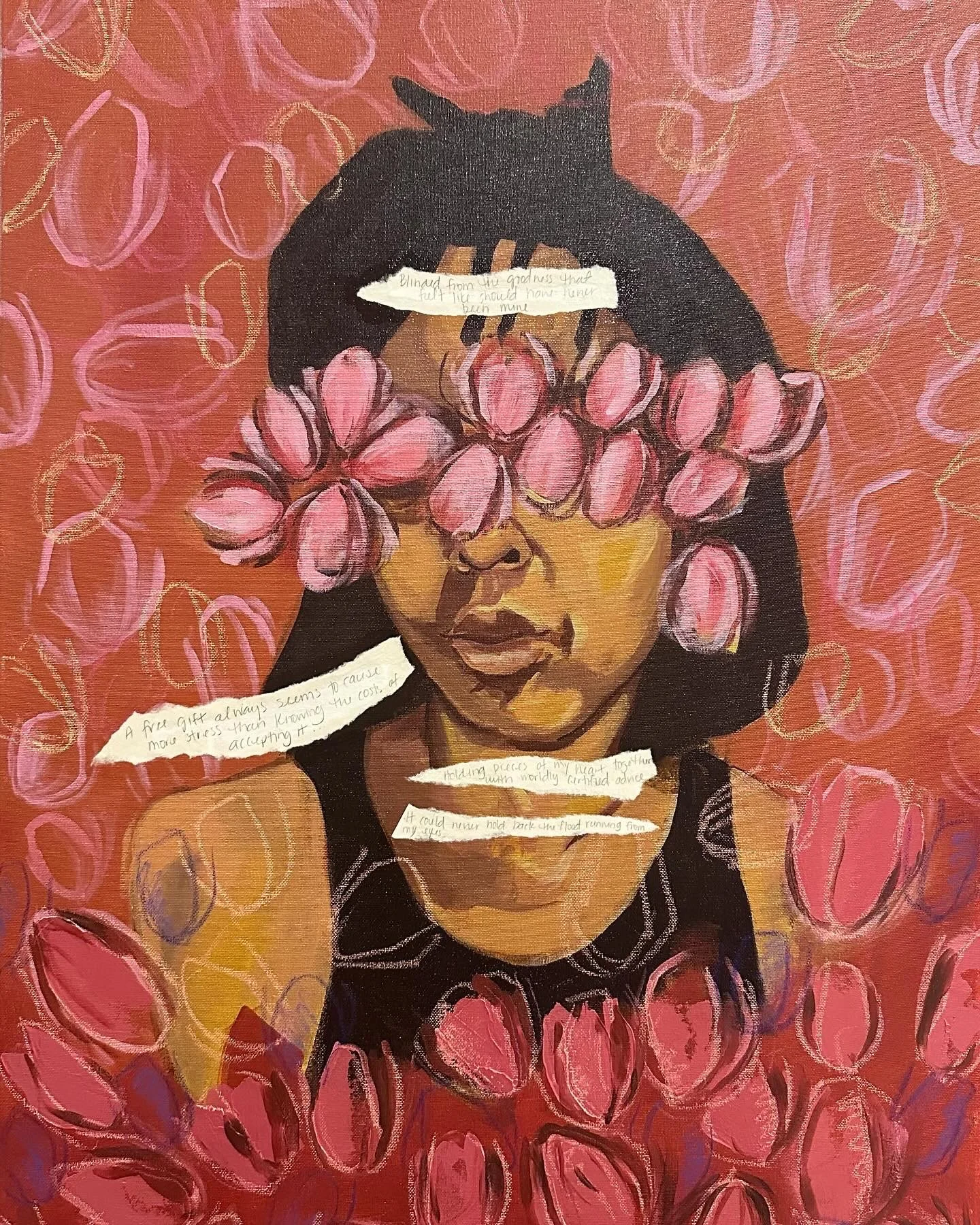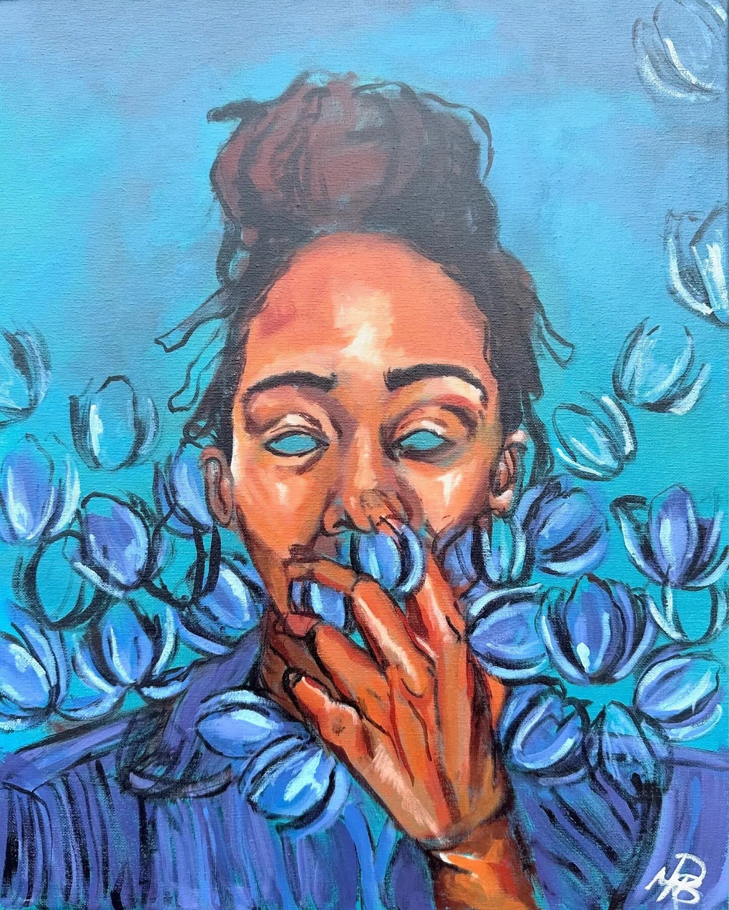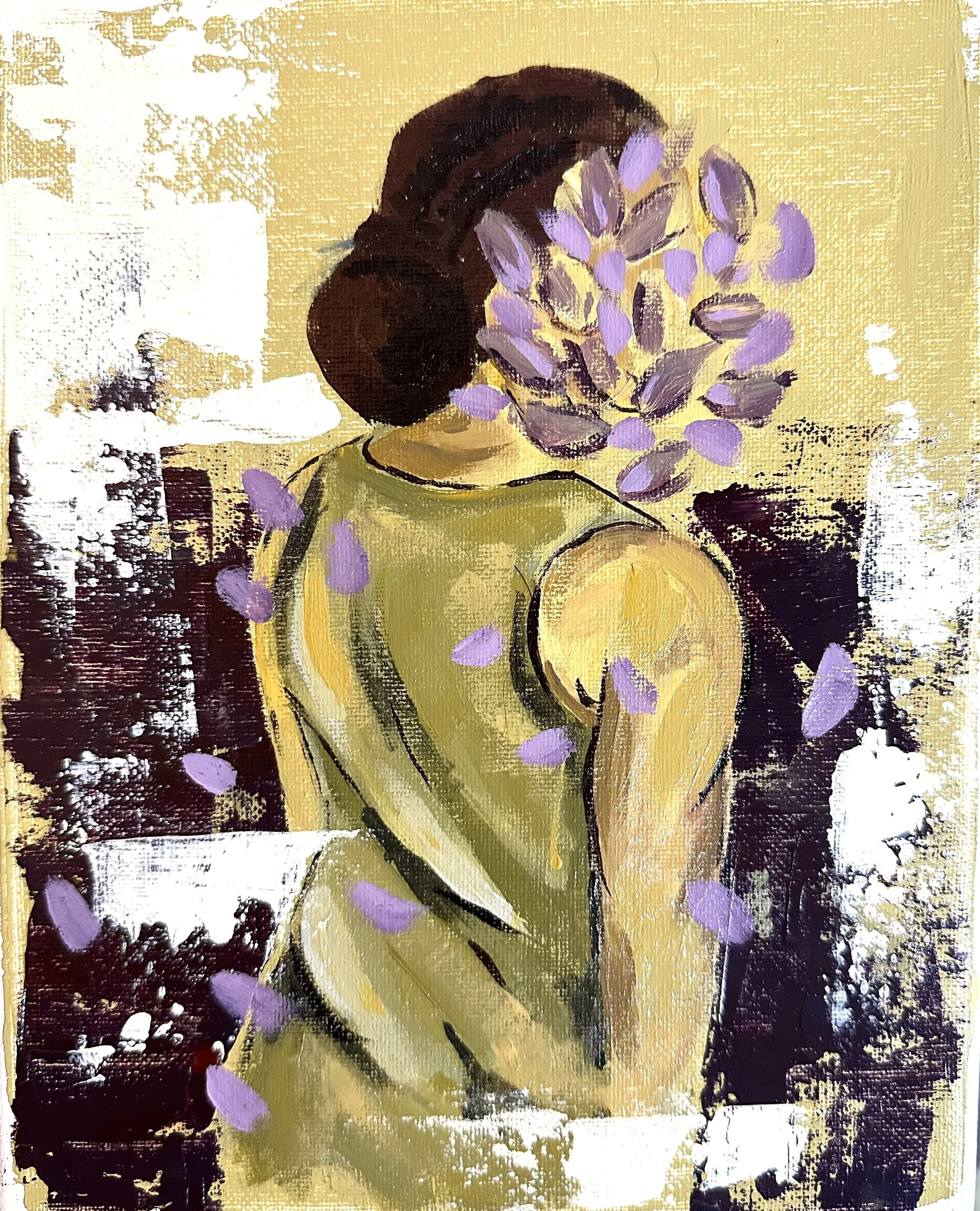This piece was painted for a local Cycle Cell Anemia Walk held on September 13th, 2025. This piece was purchased and then donated to the event organizer. While Cycle Cell Anemia is a rare, uncommonly heard illness, it nonetheless has a tremendous impact on day to day life. This piece is to show the woman using her cycle cells to help the flowers bloom. The flowers are to symbolize hope in the midst of the suffering that is caused.